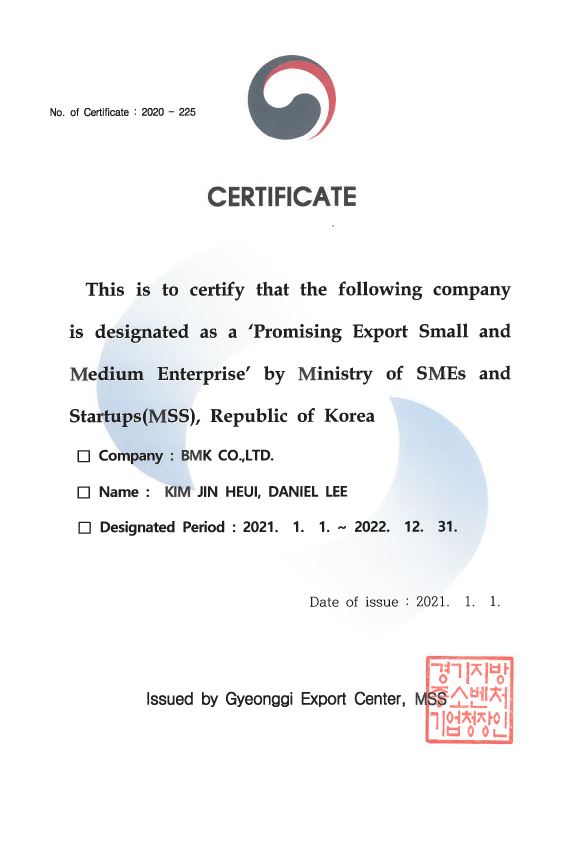 Promising Export Small and Medium Enterprise 페이지 정보 작성자 비엠케이 작성일21-01-22 10:56 조회3,201회 관련링크 이전글 다음글 목록 본문 'Promising Export Small and Medium Enterprise' by Ministry of SMEs and Startups(MSS), Republic of Korea 이전글 다음글 목록